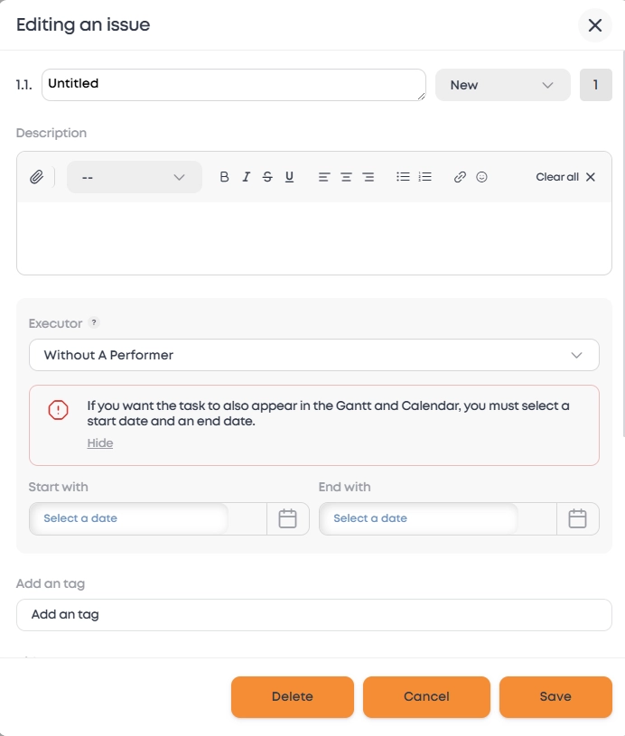 Description: Use text formatting panel to describe task in detail, highlight important points, and add lists and tags.
